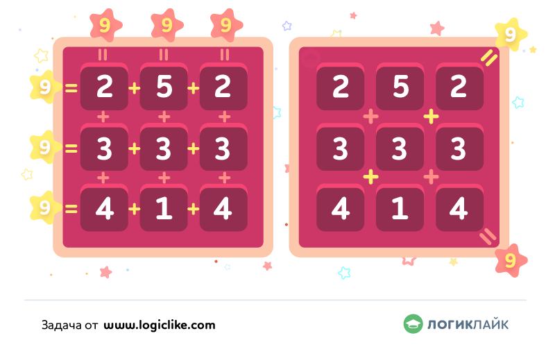 Сложите числа в решенной задаче в любой строке, в любом столбце, а также по обеим диагоналям.